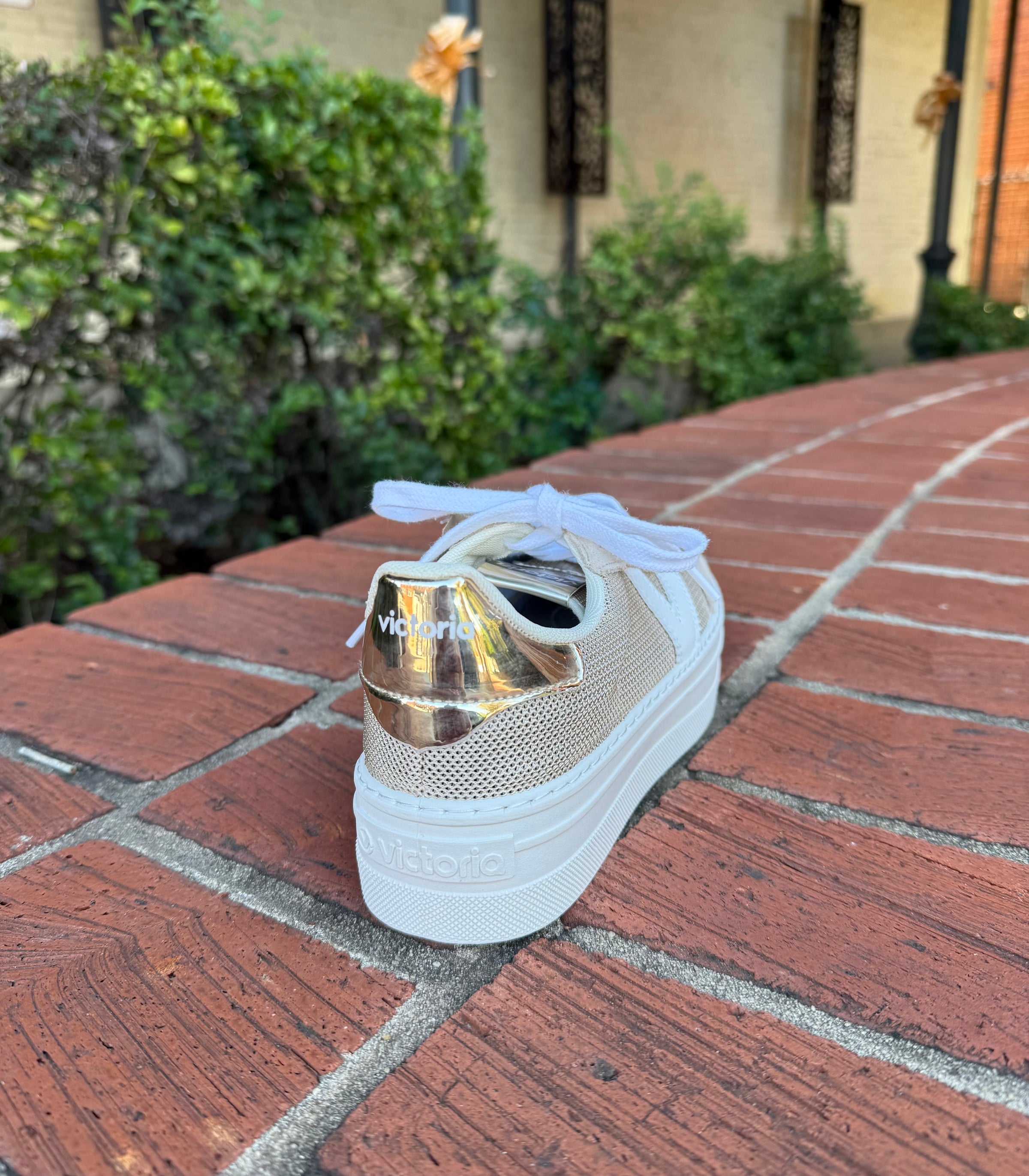 Enjoy this platform shoe from Victoria in a neutral color with a pop of metallic at the heel.