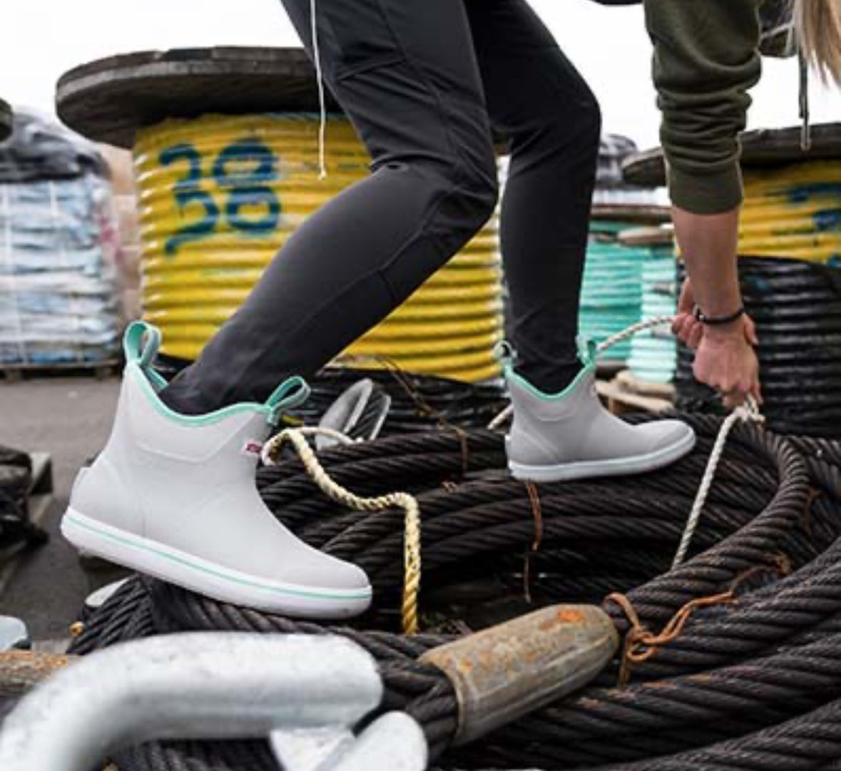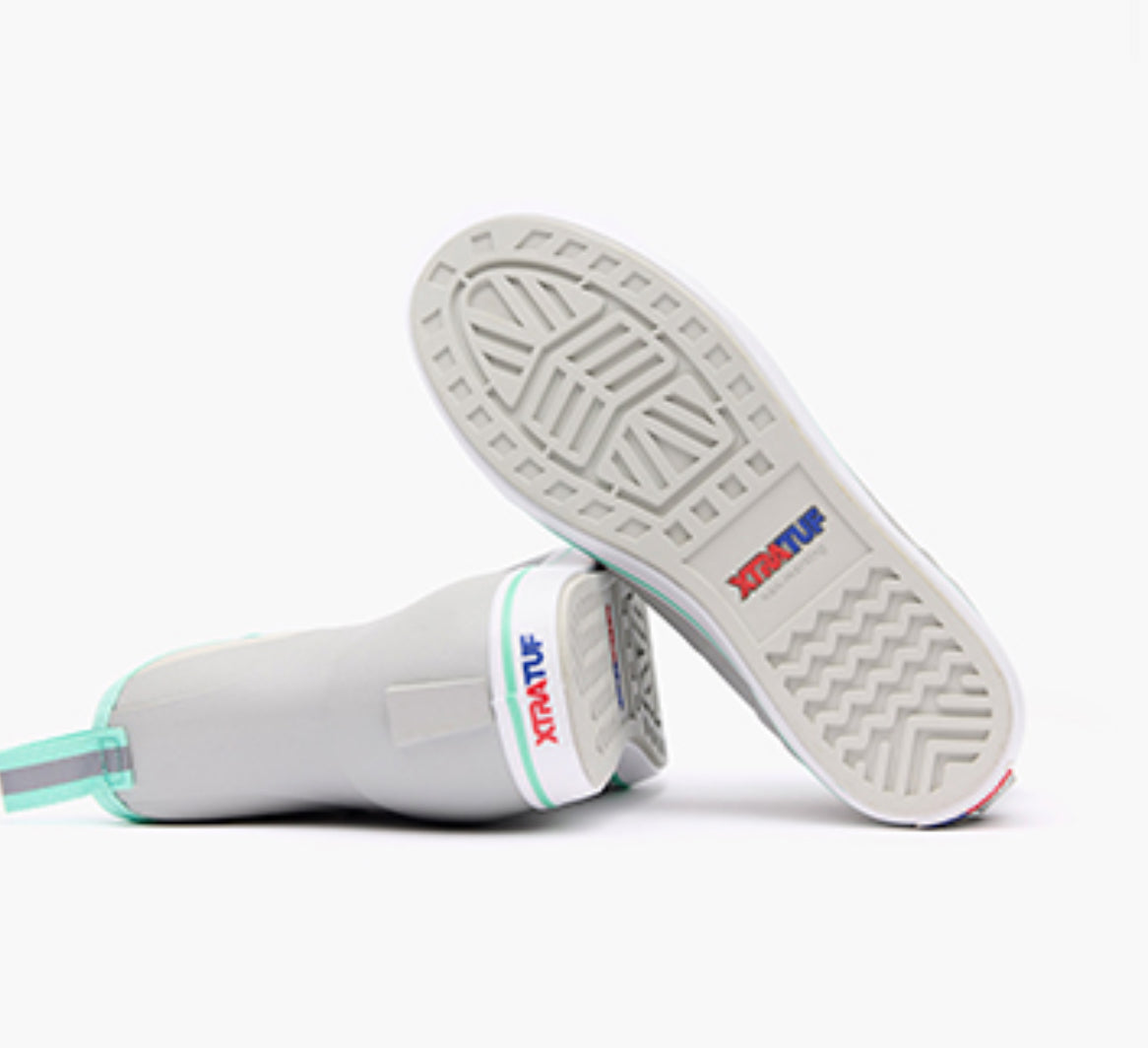 The Ankle Deck Boot collection has been crafted specifically for Off-Shore anglers. Anglers are athletes, and like any athlete they need the best footwear to help them perform at a high level. We've created a lightweight design with the same slip-resistant Chevron outsole found in our Legacy boots. The performance ankle deck boot is the perfect boot for any on the water athlete looking for protection with slip-on-and-go styling. This Light Gray boot features a complementary seafoam detail at the sole, pull-tabs and top lining for added style.